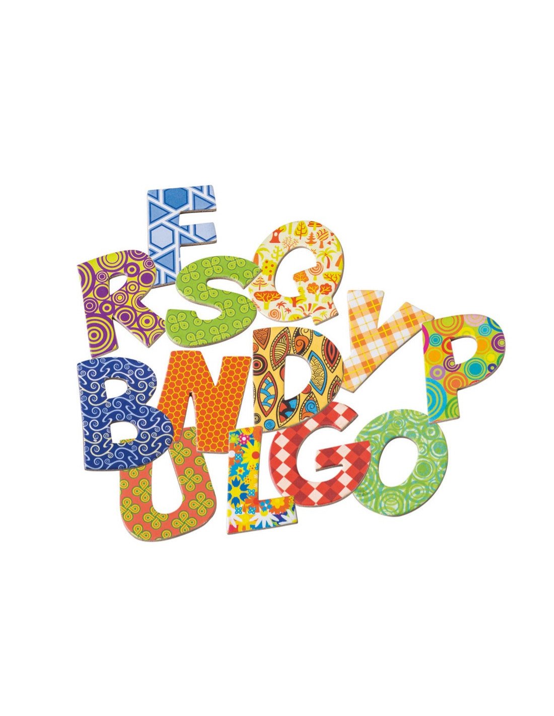 Juego con 60 letras magnéticas decoradas para crear divertidas palabras. Podrás utilizarlas sobre superficie metálica o sobre una nevera.