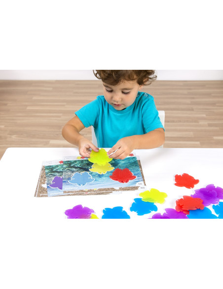 Contiene 20 tortugas de colores, 9 tarjetas con actividades