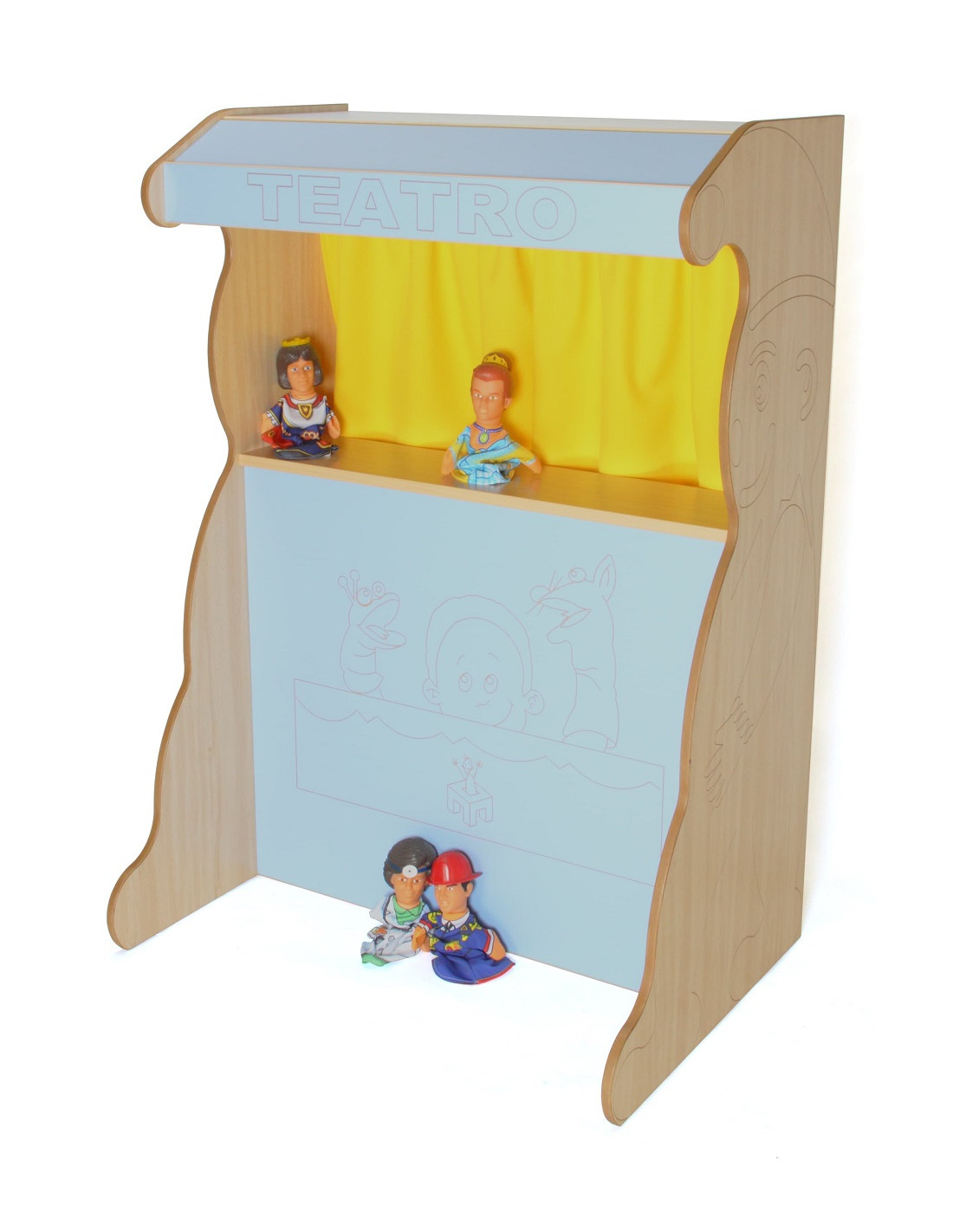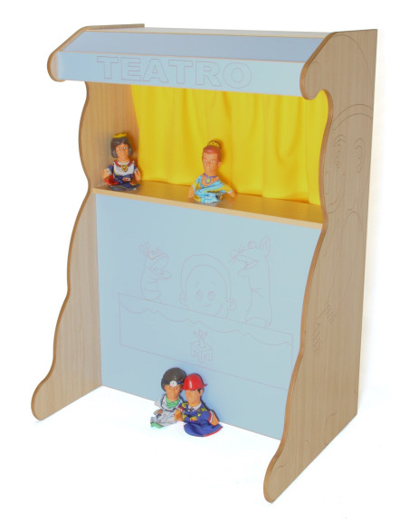 Teatro marionetas con la parte de atrás abierta con estantes.