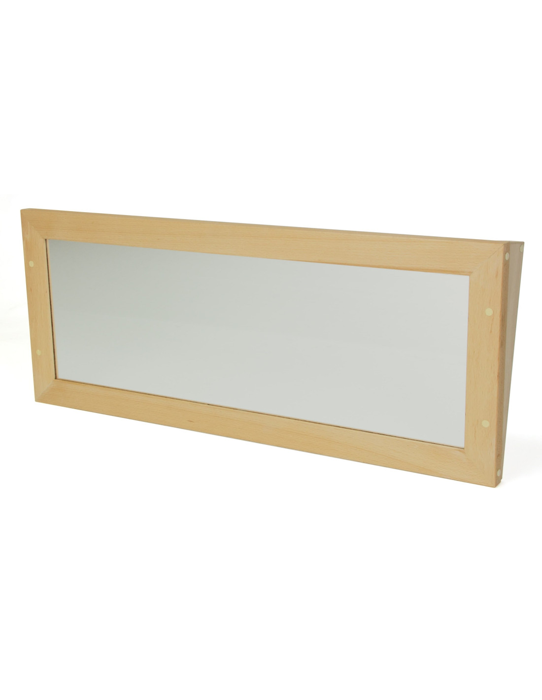 Espejo de seguridad inclinado, con espejo en lámina adhesiva, para facilitar la visión a los más pequeños de forma segura. Marco de madera maciza y robusto sistema de fijación. Cantos de PVC redondos para prevenir heridas. Medida 1000 x 10 x 400 mm.