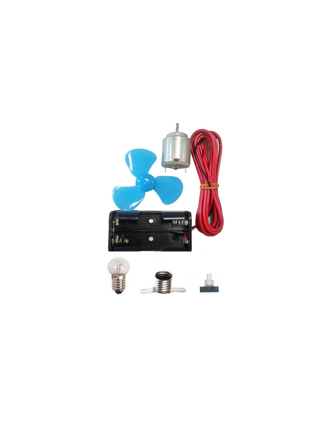 Contiene: 1 motor, 1 portalámparas, 1 lámpara, 1 interruptor, 2 cables de 1 m, 1 ventilador y portapilas.