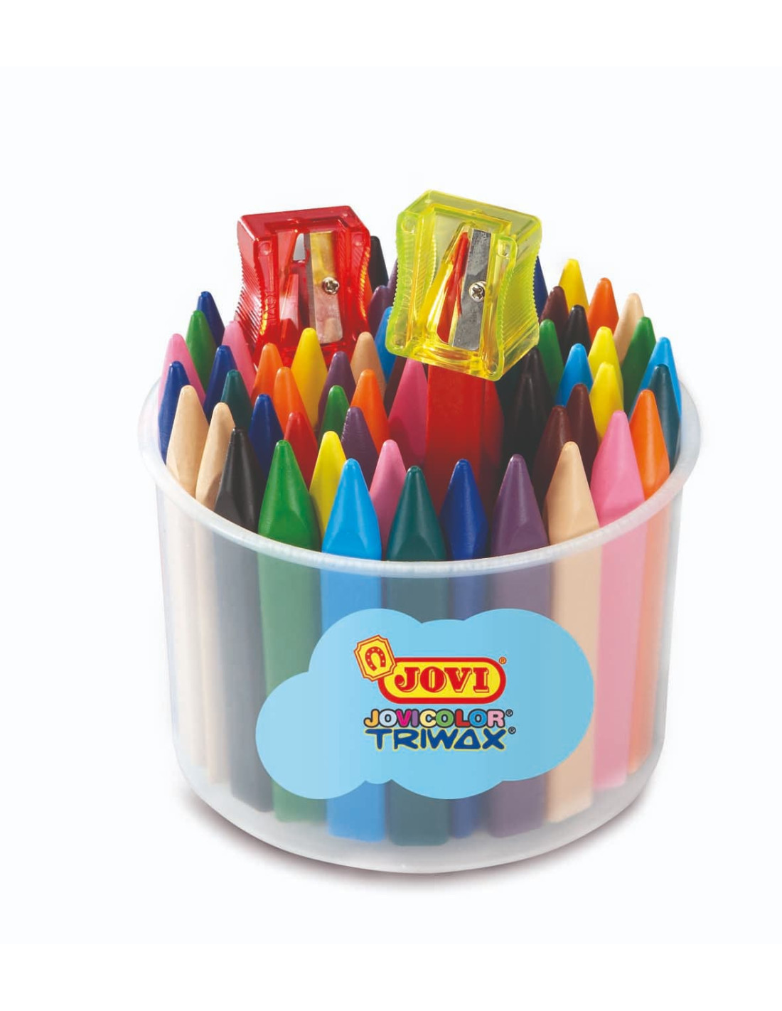 Formato escolar: Bote con 72 Ceras triangulares JOVICOLOR TRIWAX. 12 colores, 6 ceras por color. + 2 sacpuntas.