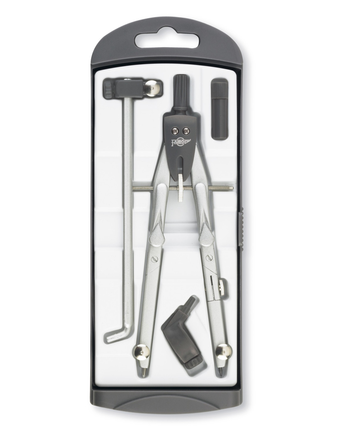Compás de ajuste rápido, con alargadera. Brazos articulados, con adaptador universal y caja de minas. Longitud del compás de 165 mm. Puede realizar circunferencias de hasta 520 mm. con alargadera. Presentado en estuche de plástico.