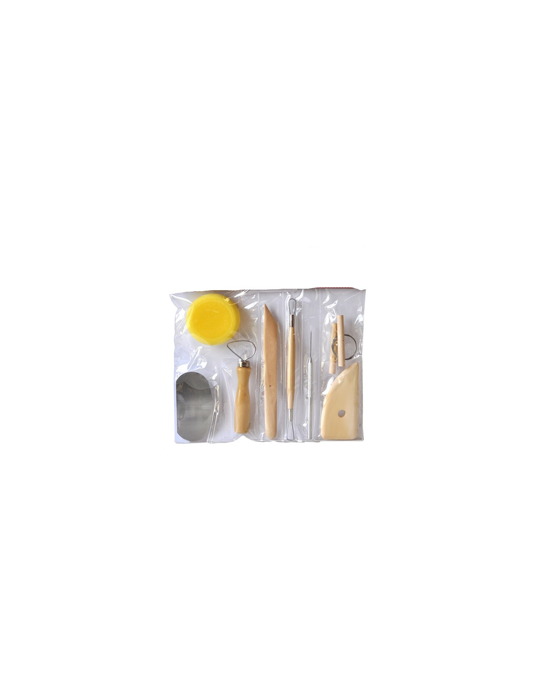 Set de 8 herramientoas para modelar. Contiene: esponja, media luna metálica, vaciador grande, espátula, hilo metálico, vaciador doble cara, media luna de madera y punzón.