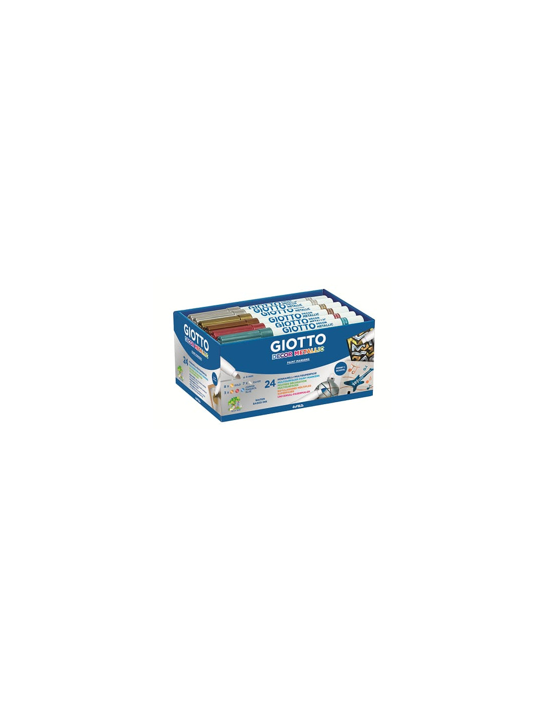 Formato escolar Schoolpack : Caja con 25 rotuladores: 8 dorados, 8 plateados, 3 magenta, 3 ocre y 3 turquesa.