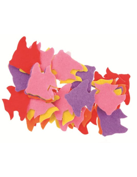 Figuras de fieltro 2 mm de grosor con adhesivo en la parte trasera. Contienen 60 uds con distintos tamaños, formas y colores.