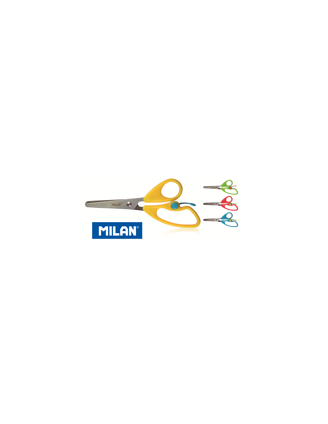 Tijeras MILAN con sistema de retorno que permite cortar con mayor facilidad. Con cuchilla de acero inoxidable con punta redondeada roma. Mango de plástico. Longitud: 14,4 cm