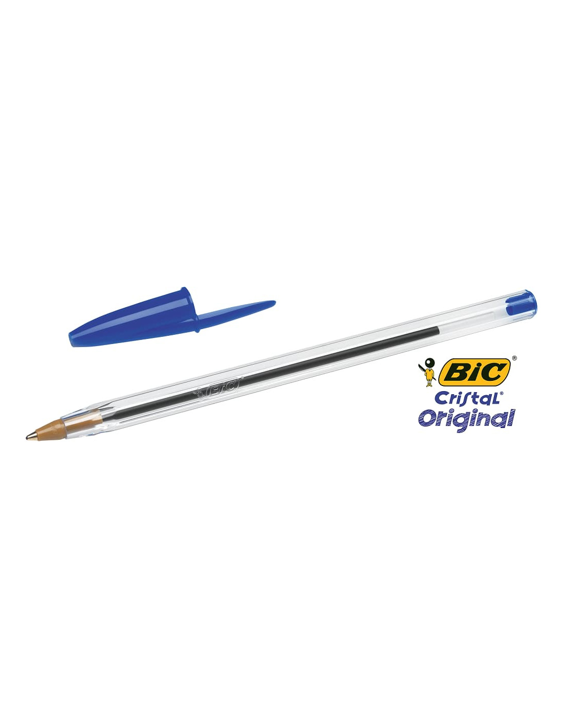 Caja con 50 bolígrafos BIC CRISTAL color AZUL. Cuerpo transparente con tapón y capuchón de seguridad ventilado. Tinta base aceite. 3000 m longitud media de escritura. Punta 1 mm, trazo 0.32 mm. Producto certificado con etiqueta ecológica NF Environment.