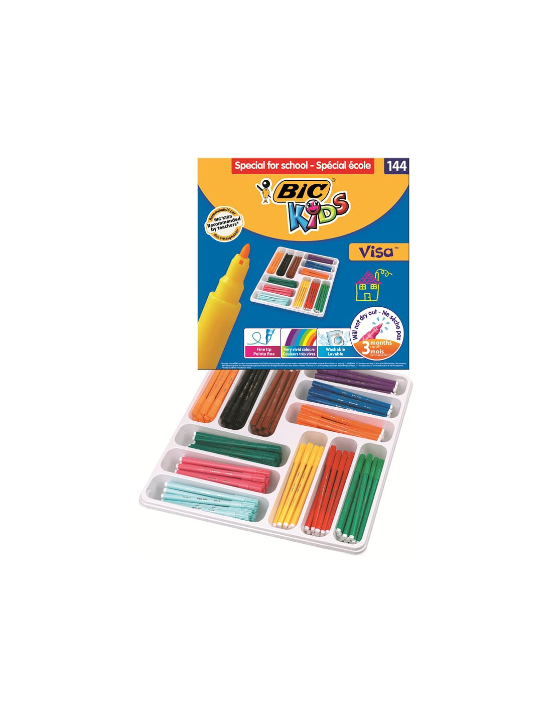 School pack con 144 rotuladores: 12 colores, 12 rotuladores por color.