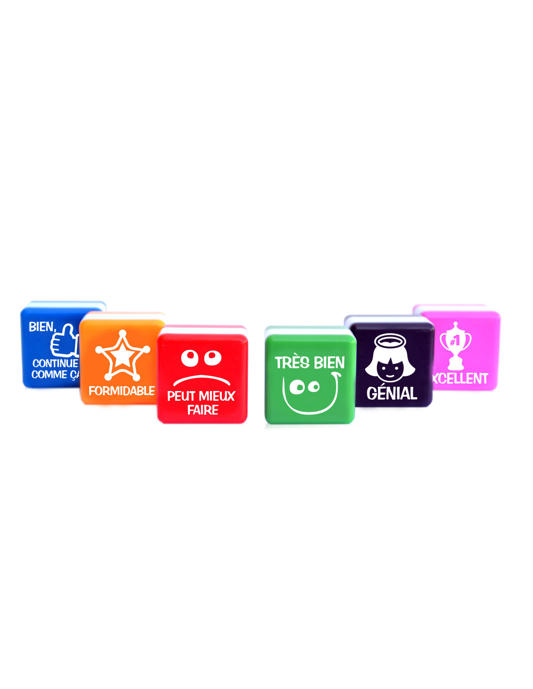 Set de 6 sellos motivadores con frases en francés. Cada sello esta preentintado en el color de la caja. MEDIDA SELLO 25 x 25 mm.