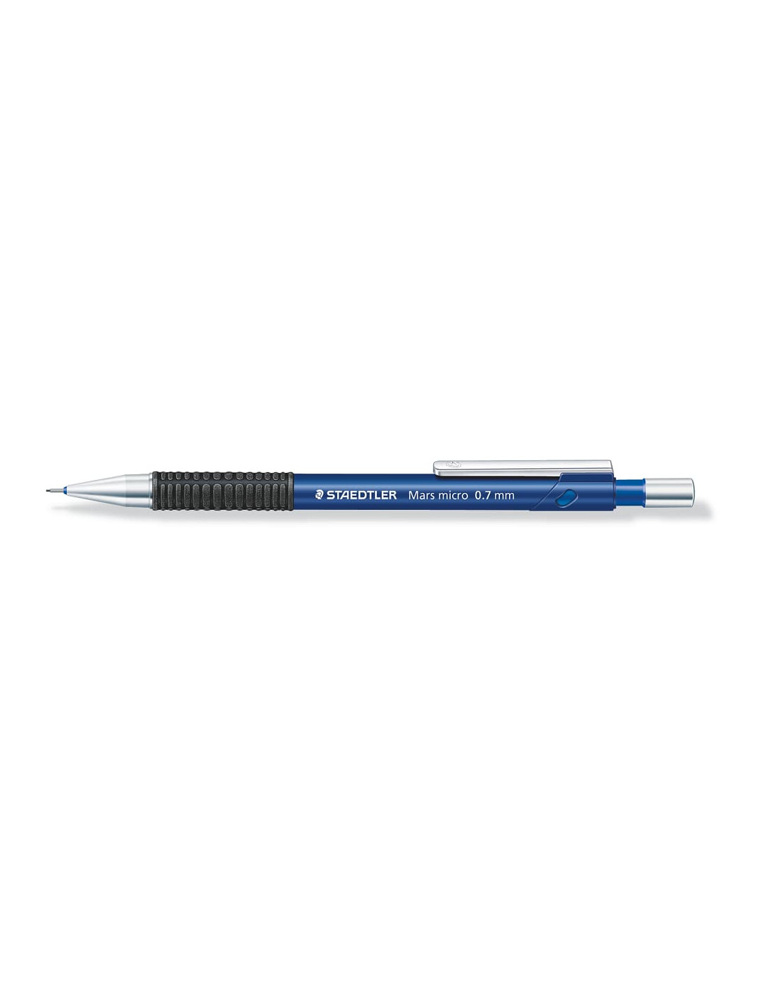 Portaminas STAEDTLER MARS MICRO 0.7 mm. ideal para escribir y dibujar. Cuerpo de plástico color azul, punta metálica retráctil, mina amortiguada. Empuñadura antideslizante de caucho. Clip, pulsado y puntera metálicos. Con goma de borrar en el pulsador.