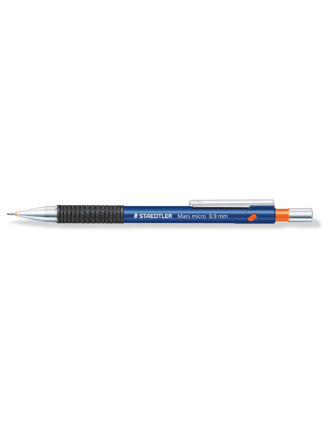 Portaminas STAEDTLER MARS MICRO 0.9 mm. ideal para escribir y dibujar. Cuerpo de plástico color azul, punta metálica retráctil, mina amortiguada. Empuñadura antideslizante de caucho. Clip, pulsado y puntera metálicos. Con goma de borrar en el pulsador.