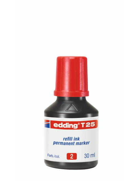 Bote de tinta permanente EDDING T25. Tinta para rellenar con sistema dispensador por goteo. Contiene 30 ml de tinta permanente libre de xileno y tolueno. El rellenado de rotuladores es respetuoso con el medio ambiente, reduce el desperdicio de material. Disponible en 10 colores.