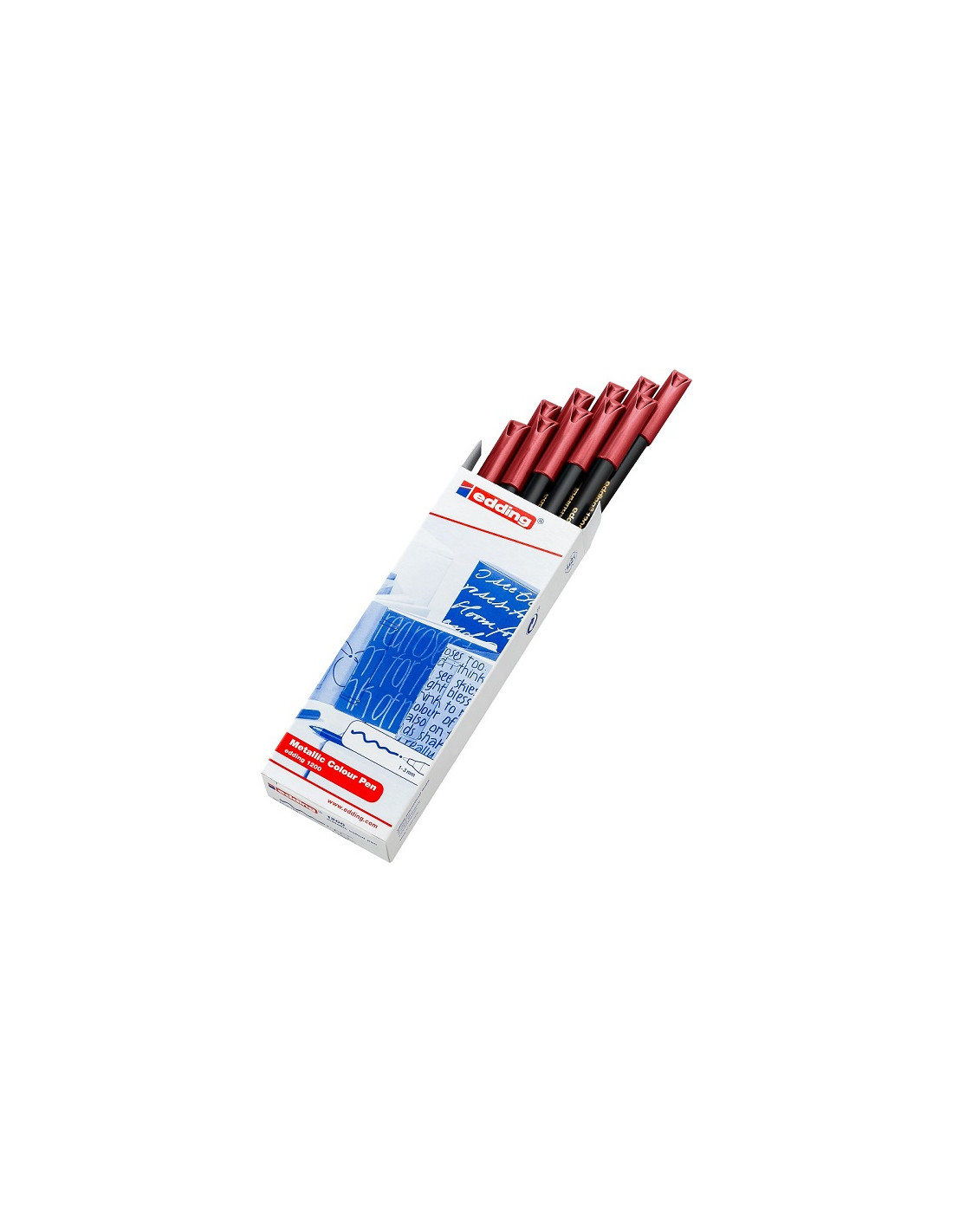 Caja con 10 rotuladores colores metálicos EDDING 1200 unicolor. Punta redonda de fibra muy resistente. Trazo 1-3 mm. Ideal para escribir, decoración, dibujos y diseños con colores metálicos sobre papel de color claro e incluso oscuro. La tinta de colores metálicos brillantes asegura una gran cobertura incluso en papel de color oscuro. La tinta a base de agua es extremadamente resistente a la acción de la luz. Capuchón ventilado de seguridad anti ahogamiento. Disponible en 6 colores metáli