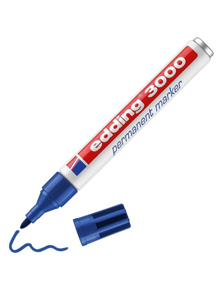 Rotulador permanente EDDING 3000. Punta de fibra muy resistente. Trazo 1.5 - 3.0 mm. Cuerpo de aluminio de alta calidad. Ideal para marcar y etiquetar dobre casi todos los materiales: papel, cartón, metal, plástico y vidrio. Tinta resistente al agua y al roce sobre casi todas las superficies. Tinta casi inodora y libre de xileno y tolueno. Rellenable con tinta EDDING. Disponible en 20 colores.