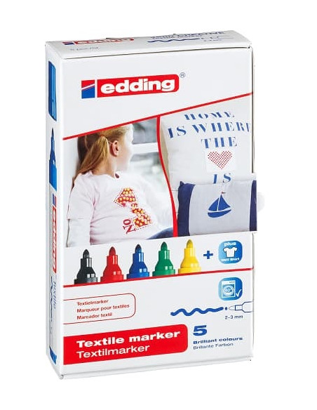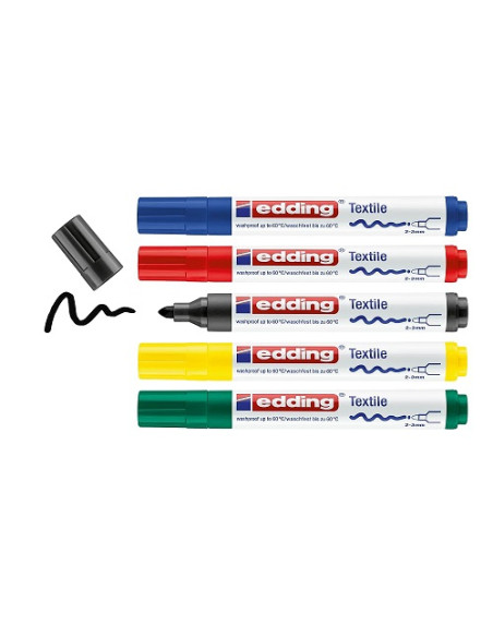 Rotulador TEXTIL EDDING 4500. Ideal para decorar y dibujar sobre la mayoría de los tejidos claros, como el algodón, la seda y el lino. Punta redonda y robusta. Trazo 2-3 mm. Tinta pigmentada a base de agua, de olor neutro. Secado rápido y resistente a la luz. Resistente al lavado hasta 60° tras fijar la tinta planchando la prenda (sin vapor).