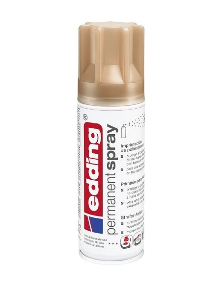 Spray con 200 ml de pintura acrílica premium EDDING. Pintura acrílica permanente de alta calidad para restaurar, renovar y embellecer rápida y fácilmente casi todo tipo de materiales. Ideales para decorar y retocar. Resultados optimos en superficies absorbentes, plástico que admita recubrimiento o poliestireno. Es de secado ultra rápido, resistente a la intemperie y a la acción de la luz. Cabezal rociador con anchura aprox. de 5-6 cm. Disponible en 27 colores mates y 3 colores brillantes.