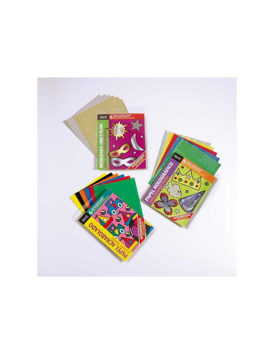 Bloc de trabajos manuales con 5 hojas A4 papel holográfico autoadhesivo colores surtidos. Tamaño hoja: A4 Colores: Blanco, amarillo, rojo, azul y verde.