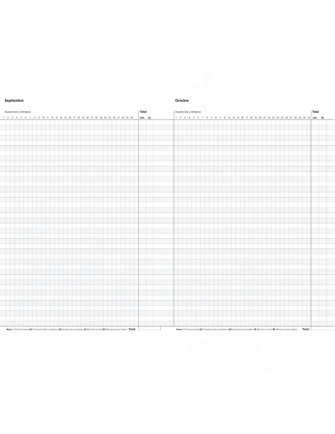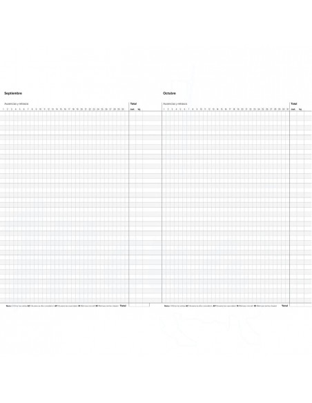 Cuaderno de registro de asistencia para el control del alumnado, datos personales y horario. Encuadernación grapada. TAMAÑO 19,5 x 28,5 cm. 16 páginas.