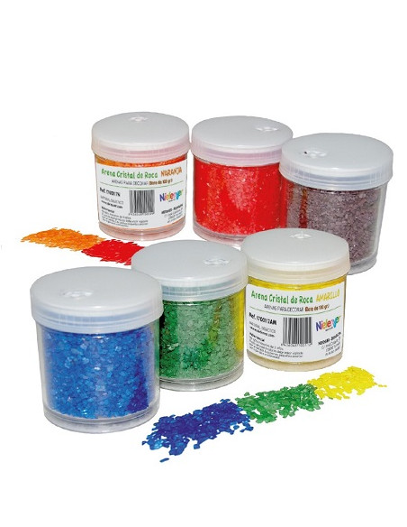 Arena de grano grueso ideal para actividades creativas. Bote 100 gr. con dosificador. Color amarillo