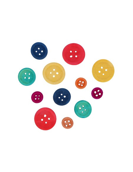 Botones de madera de colores de alta calidad para todo tipo de manualidades. INCLUYE 12 botones 12 mm. 12 botones 18 mm. 6 botones 22 mm. 6 colores distintos