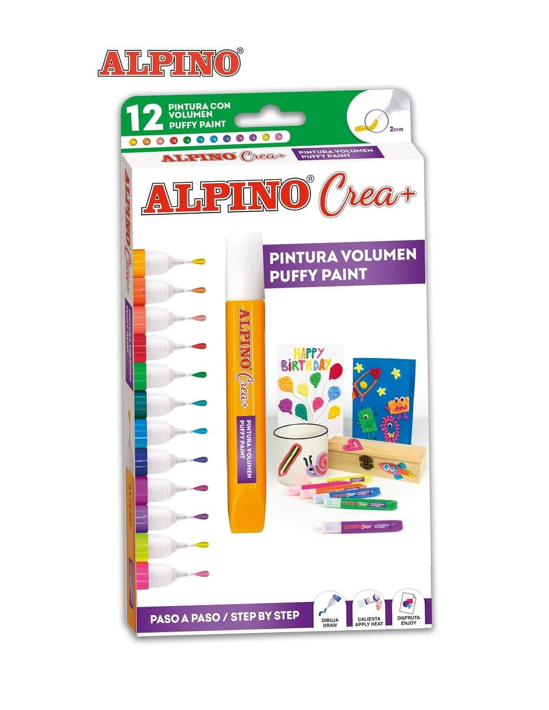 Caja con 12 tubos de pintura con efecto 3D para decorar en casi todas las superficies. Una vez este seco completamente, aplica calor con un secador y el dibujo empezara a tener volumen. Su pinta con aplicador permite una mejor aplicación. Edad recomendada +3 años.