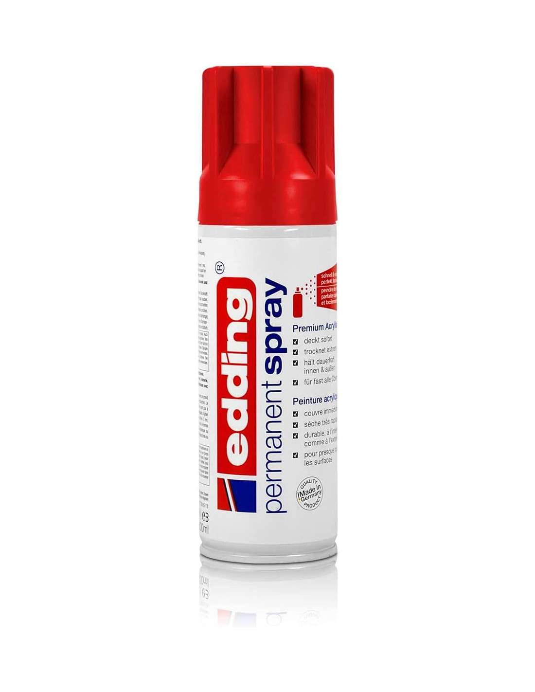 Spray con 200 ml de pintura acrílica premium EDDING. Pintura acrílica permanente de alta calidad para restaurar, renovar y embellecer rápida y fácilmente casi todo tipo de materiales. Ideales para decorar y retocar. Resultados optimos en superficies absorbentes, plástico que admita recubrimiento o poliestireno. Es de secado ultra rápido, resistente a la intemperie y a la acción de la luz. Cabezal rociador con anchura aprox. de 5-6 cm. Disponible en 27 colores mates y 3 colores brillantes.