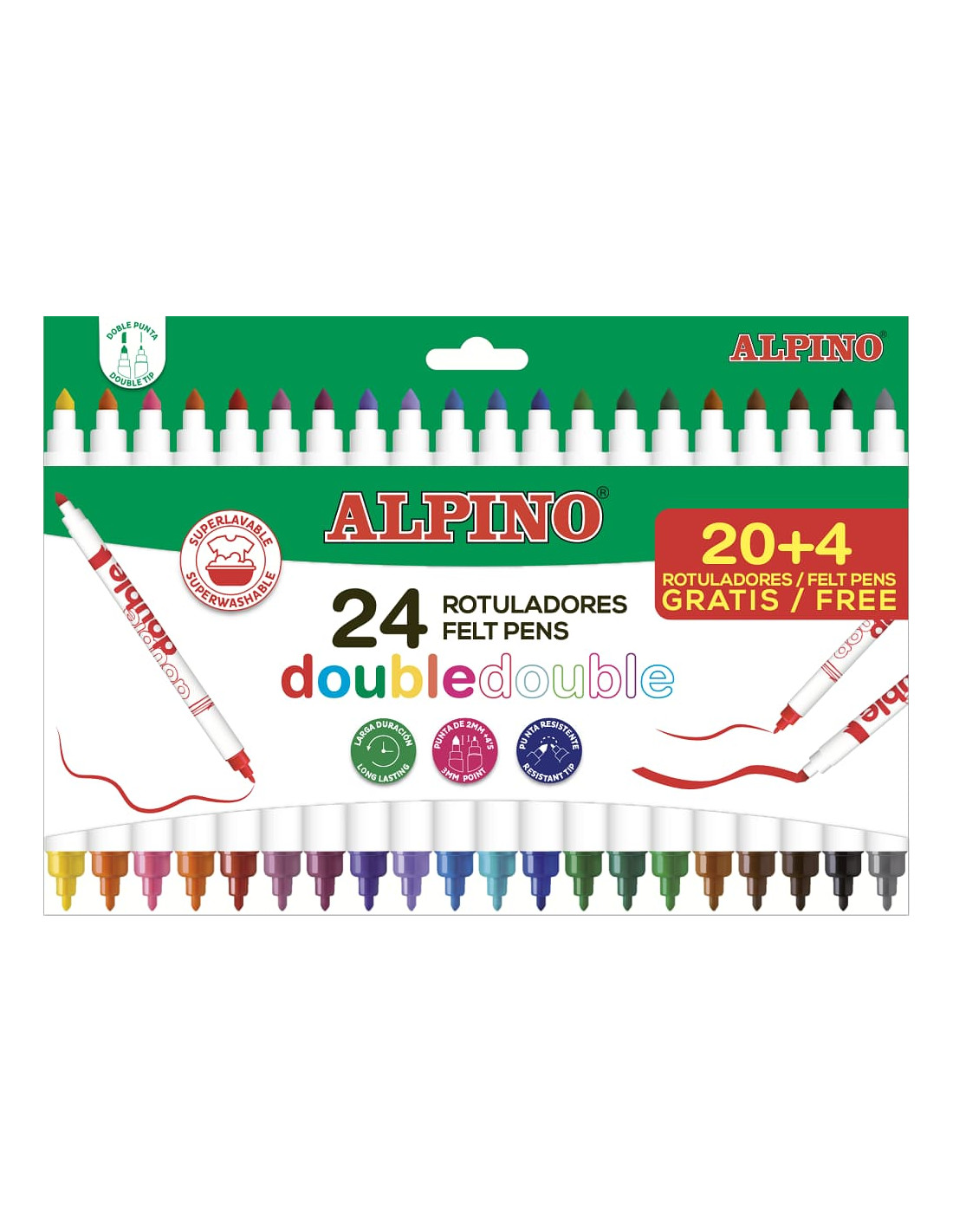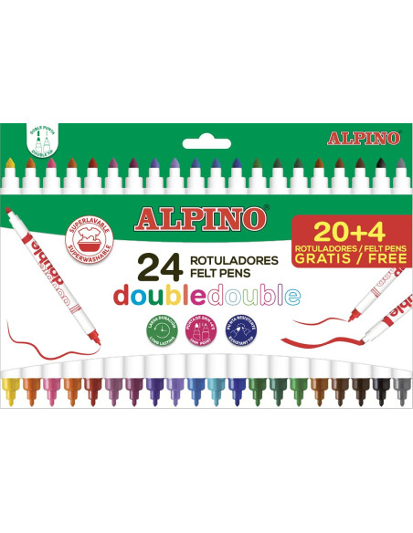 Caja con 24 Rotuladores ALPINO DOUBLE DOUBLE colores SURTIDOS. Rotuladores con doble punta, elige si punta fina o punta gruesa, todo en el mismo rotulador. Cuerpo redondo. Punta resistente y bloqueada. Capuchón de seguridad ventilado. Tinta súper lavable. Colores brillantes. Edad: + 3 años.