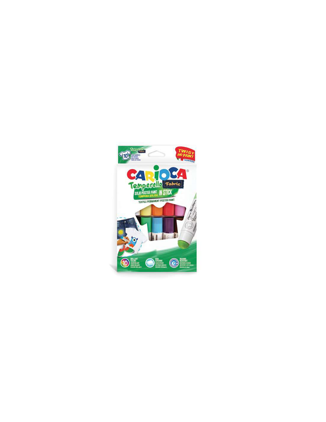 Caja de 10 témperas textil en formato stick. Para fijar el dibujo sobre la tela, coloca sobre el dibujo papel de horno y pasa la plancha 2-3 minutos. Una vez fijado el dibujo sobre la tela, se puede lavar en la lavadora hasta 60° C