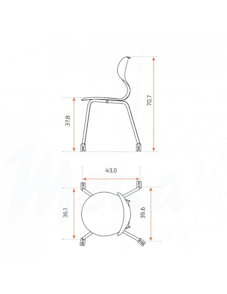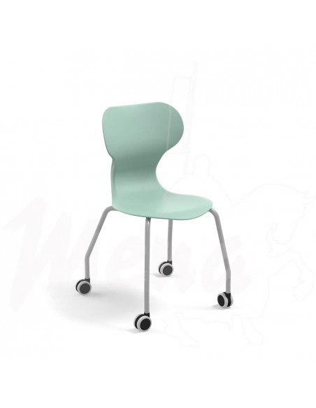Incorpora una base de polipropileno en forma de estrella y una estructura metálica de cuatro patas con acabado WARM GRAY, equipada con ruedas que facilitan el desplazamiento y aportan movilidad y versatilidad al aula.