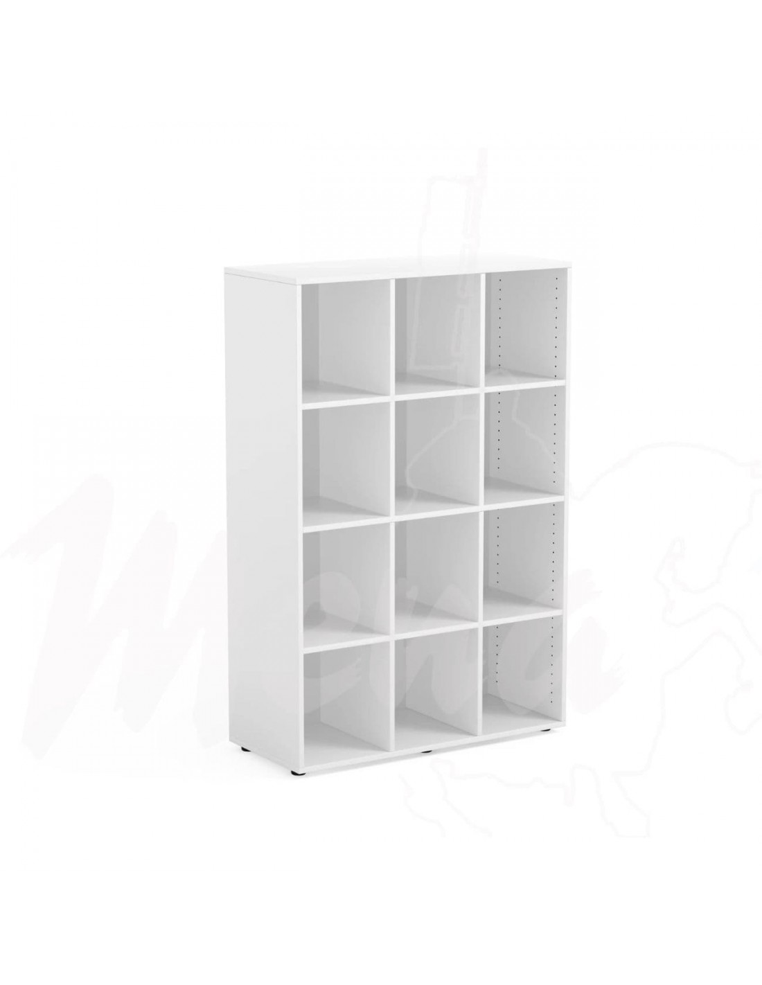 Mueble escolar con espacio interior de almacenaje. Ideal para equipar las clases. Con 12 espacios de almacenaje. Estructura de aglomerado de alta densidad con 4 tacos niveladores. Estructura blanca. Altura 160 cm.