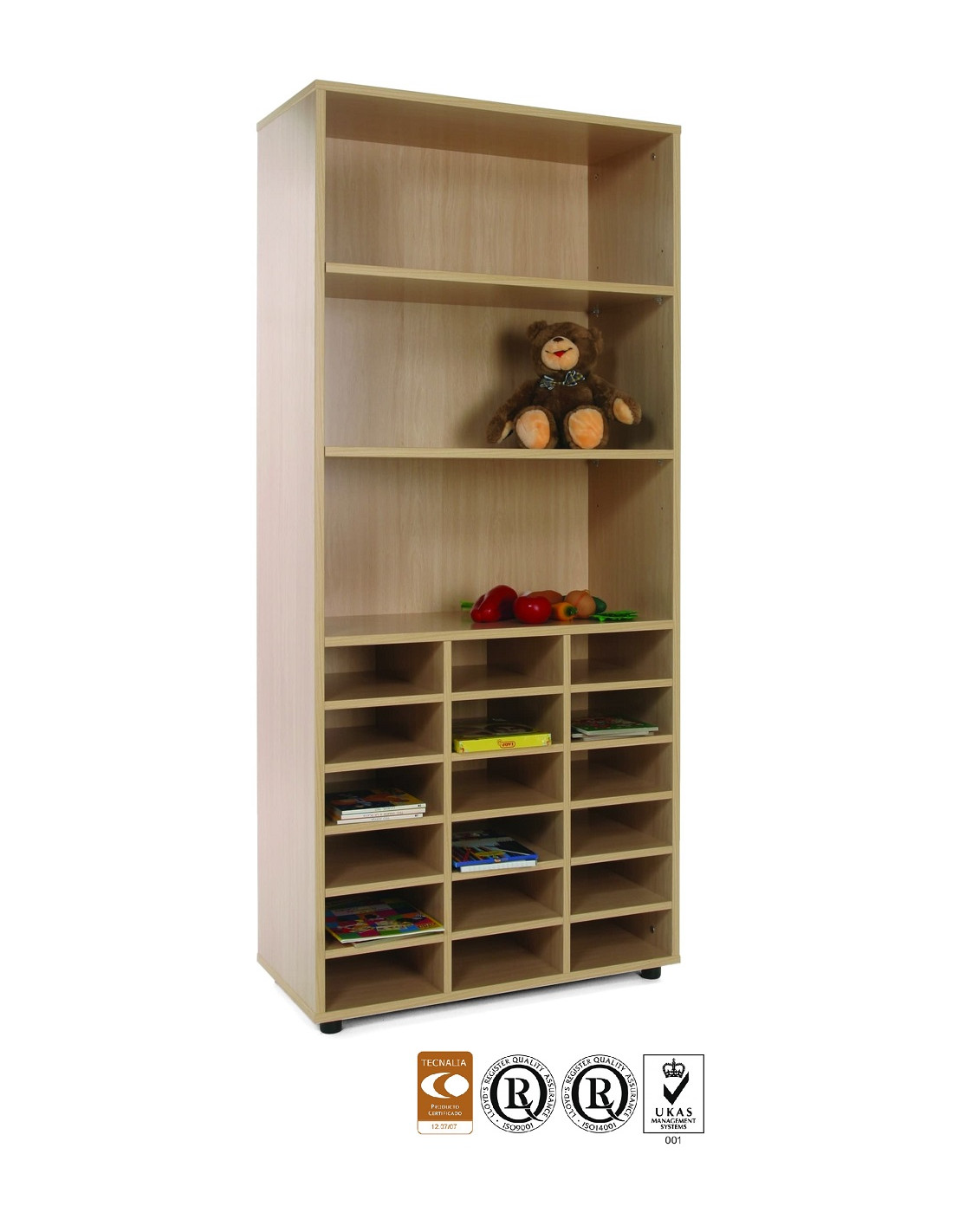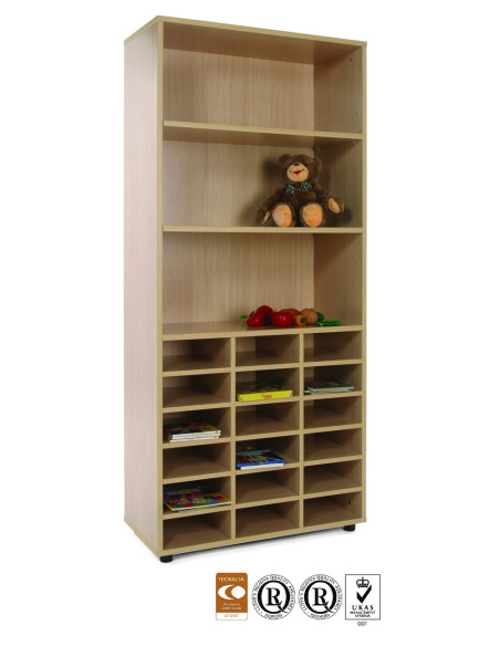 Mueble alto con tres estantes en la parte superior y dieciocho casillas