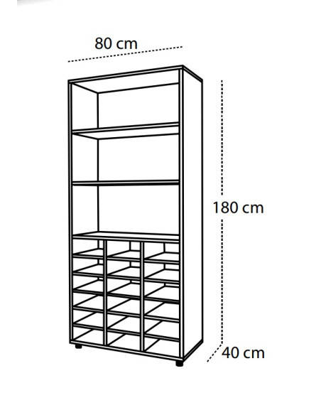 Mueble alto con tres estantes en la parte superior y dieciocho