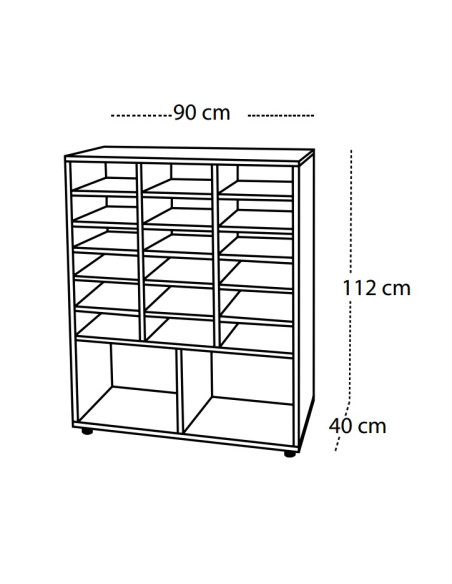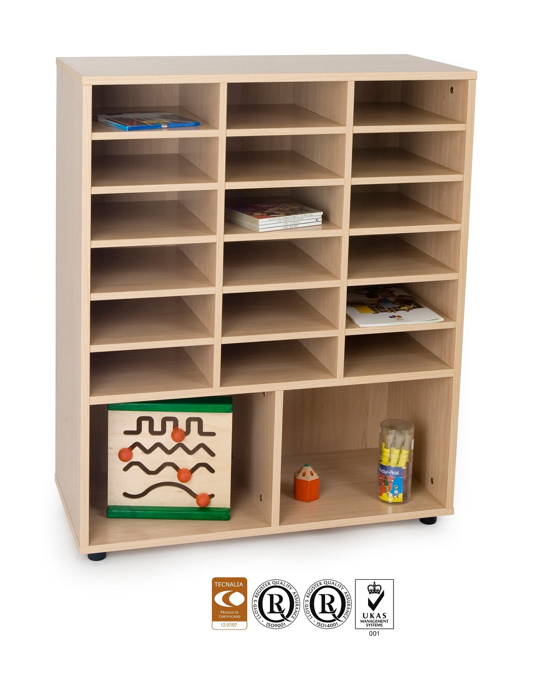 Mueble casillero con veinte casillas. Fabricado en melamina de haya, con cantos de PVC redondos para prevenir heridas. Pies niveladores PVC regulables en altura de 35 a 50 mm. Producto con certificado de calidad TECNALIA. Consultar para combinar colores de baldas y estructura. Medida 900 x 400 x 1120 mm.