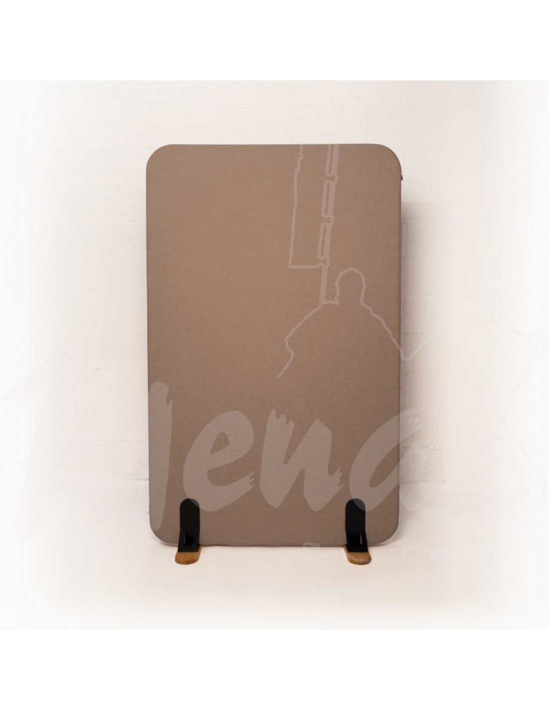 Divisor acústico fabricado de alto rendimiento. Panel de fibra de poliéster tapizado con tela acústica. Densidad de 2800 gm y resistencia a la llama Clase A Multifuncional y móvil. Certificado de emisiones C0V. Pies fabricados en metal lacados negros y madera de haya. Medida 120 x 100 cm.