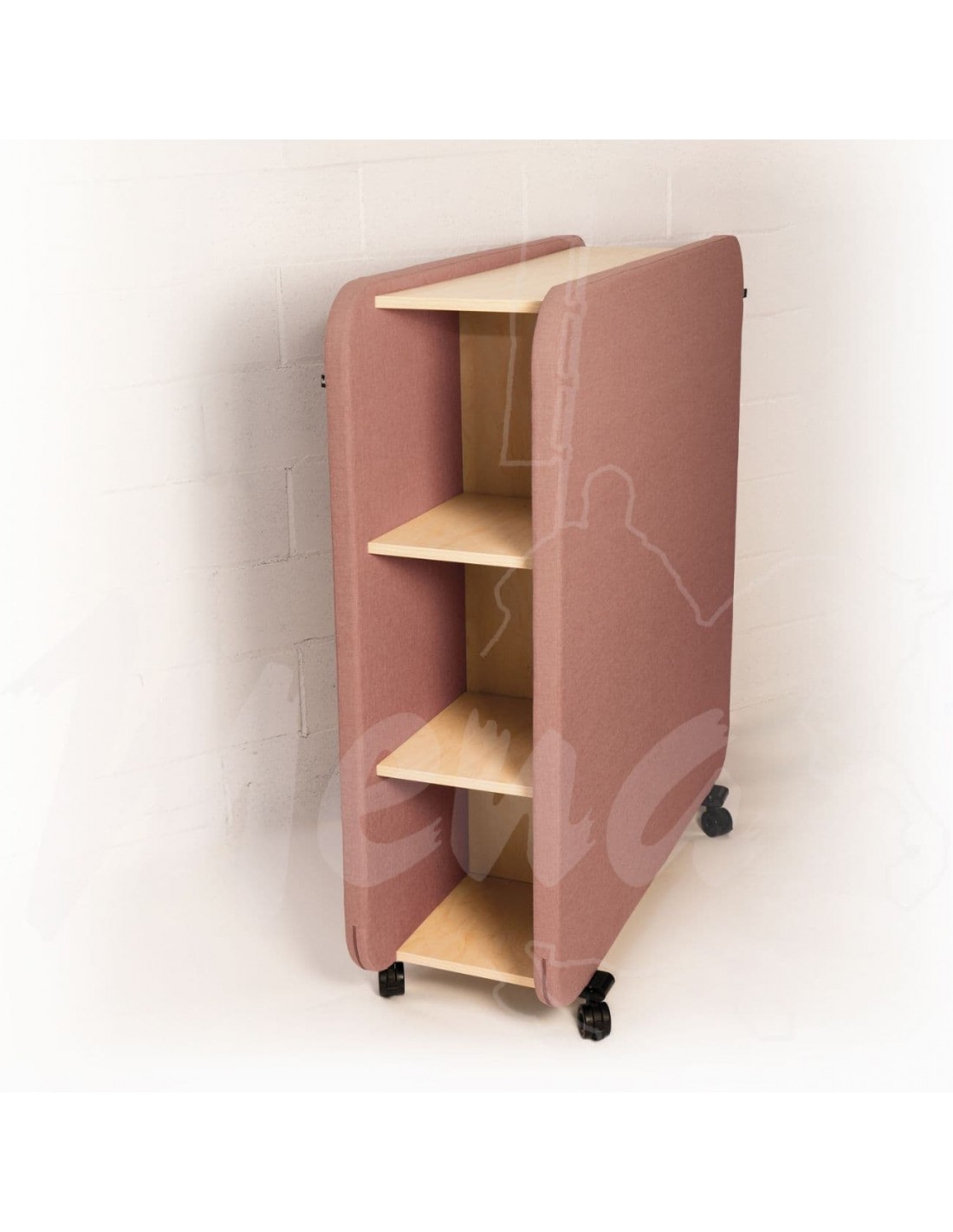 Carro acústico fabricado de alto rendimiento, con 6 estantes de madera de almacenaje. 4 ruedas con freno. Panel de fibra de poliéster tapizado con tela acústica. Densidad de 2800 gm y resistencia a la llama Clase A Multifuncional y móvil. Certificado de emisiones C0V. Pies fabricados en metal lacados negros y madera de haya. Medida 120 x 39,8 x 129 cm.