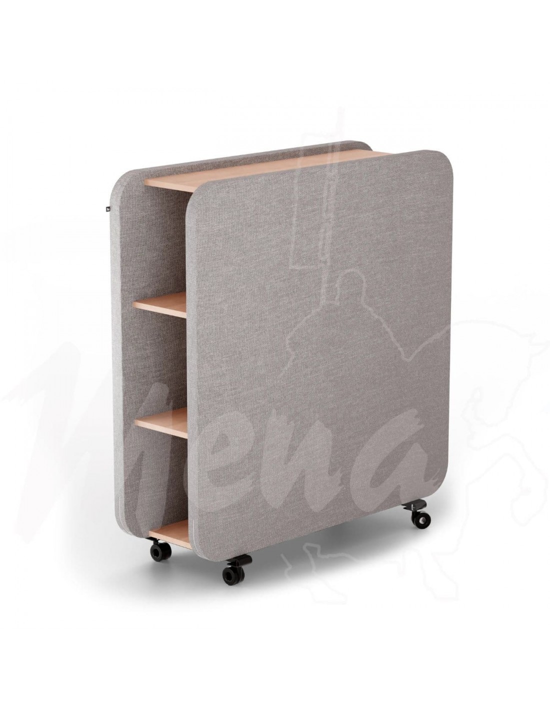 Carro acústico fabricado de alto rendimiento, con 6 estantes de madera de almacenaje. 4 ruedas con freno. Panel de fibra de poliéster tapizado con tela acústica. Densidad de 2800 gm y resistencia a la llama Clase A Multifuncional y móvil. Certificado de emisiones C0V. Pies fabricados en metal lacados negros y madera de haya. Medida 120 x 39,8 x 129 cm.