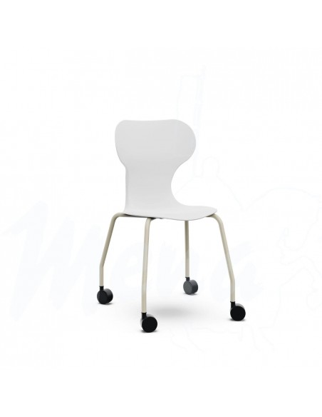 Incorpora una base de polipropileno en forma de estrella y una estructura metálica de cuatro patas con acabado WARM GRAY, equipada con ruedas que facilitan el desplazamiento y aportan movilidad y versatilidad al aula.